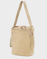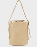 Il secchiello Melanie presenta una chiusura a coulisse e manico regolabile con dettaglio incrociato sui bordi. L'interno è foderato e con taschini interni. Una scelta grintosa ed originale.