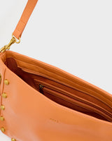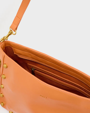 Porto è una borsa dalle dimensioni contenute, semplice ma con dettagli grintosi che non la rendono la "classica borsa". Presenta, infatti, delle borchie in color oro antichizzato che definiscono i bordi e un taschino laterale con tirazip, comodo per riporre gli effetti personali di primo utilizzo. La tasca principale è chiusa con cerniera, mentre l'interno è foderato e arricchito da taschini porta oggetti. Ha anche una doppia tracolla, una più corta per portabilità a spalla e una più lunga per vestibilità trasversale.