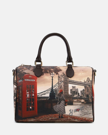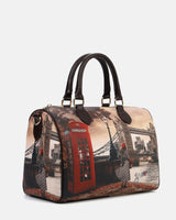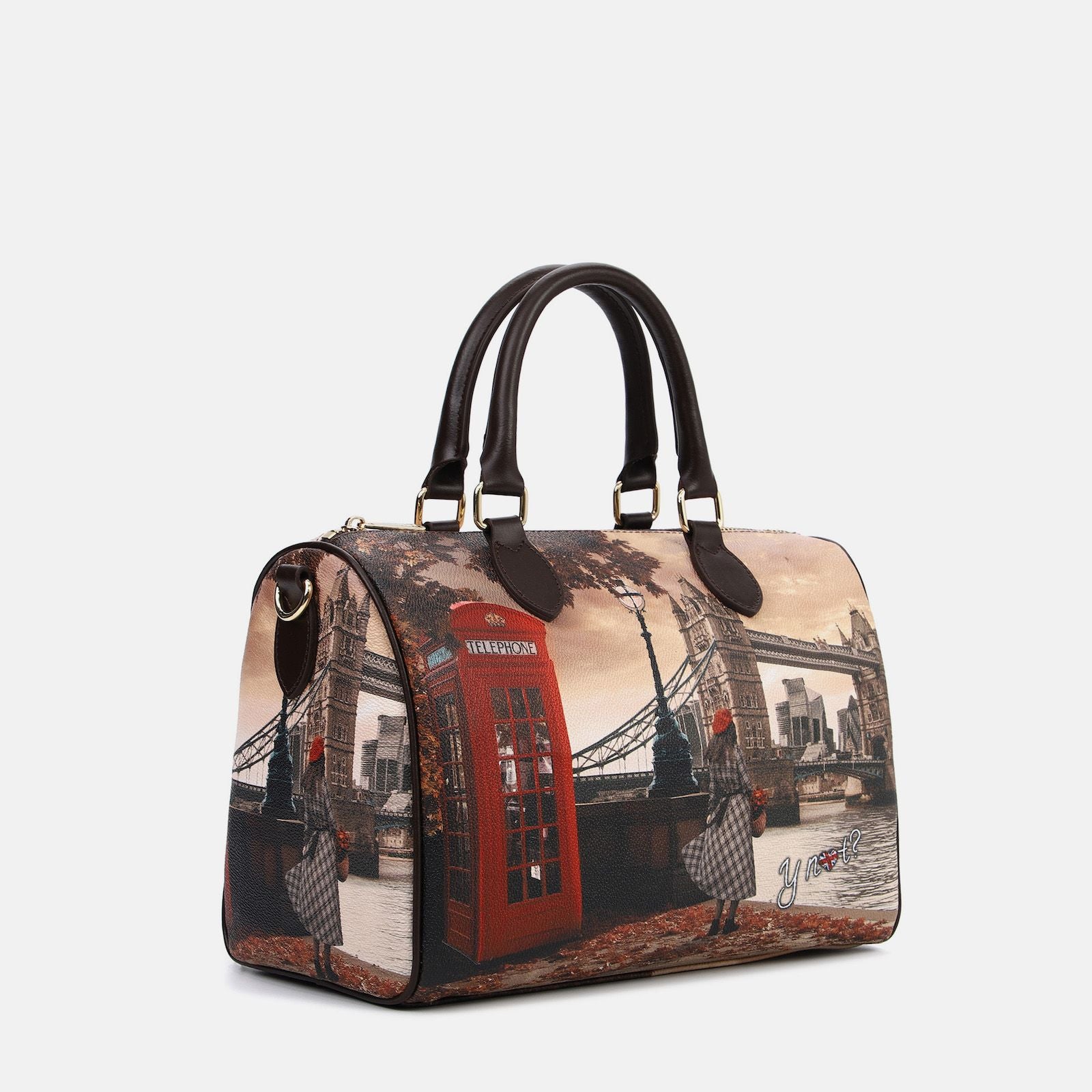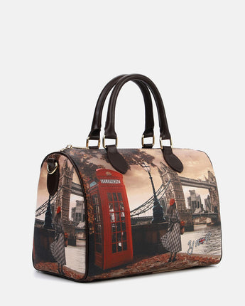 Il Bauletto London Bridge è una borsa di medie dimensioni, foderata internamente e con taschini. Presenta una chiusura a zip. E' arricchita di tracolla regolabile e removibile. I manici e le rifiniture sono in pelle, mentre la stampa è in ecopelle.