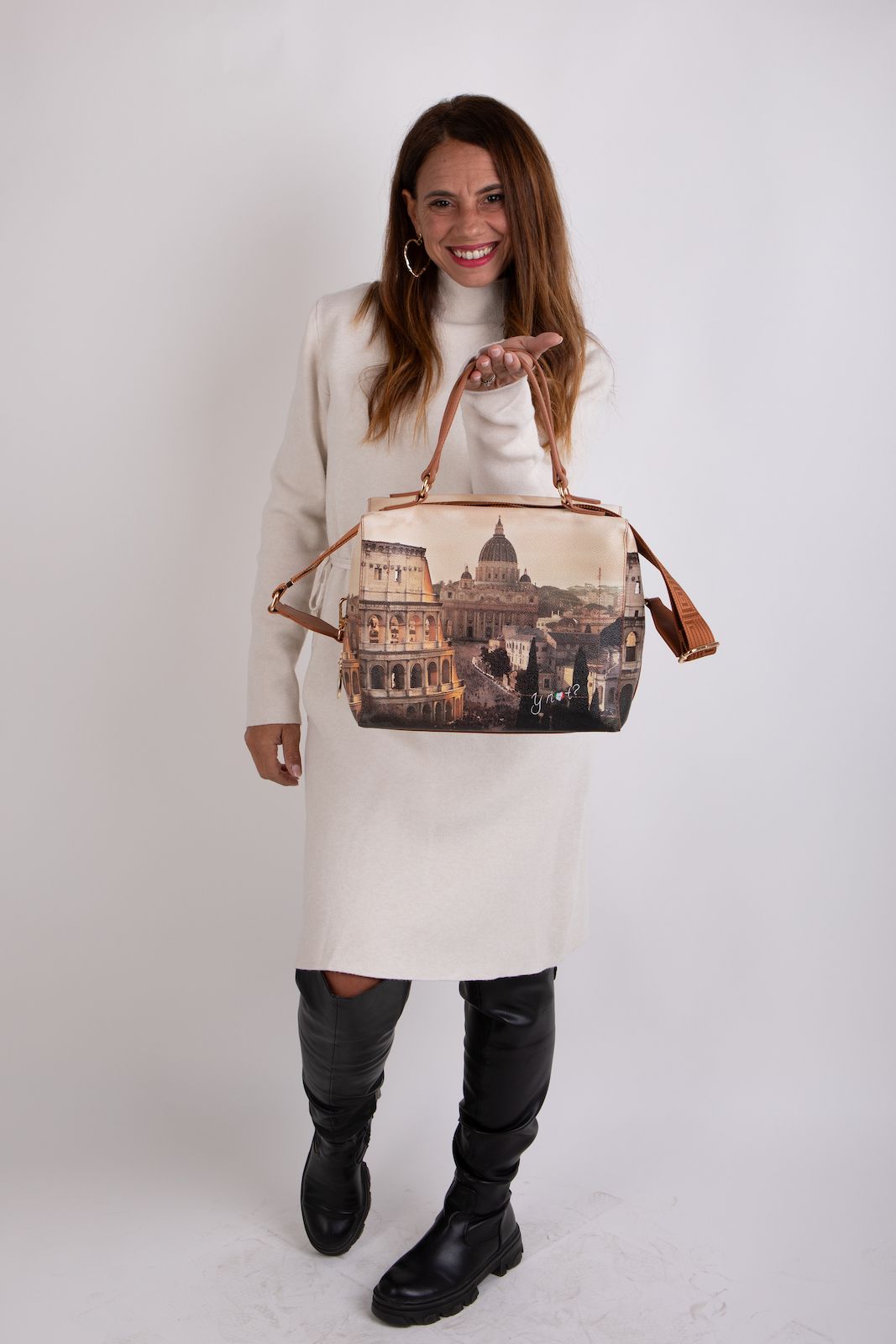 Il bauletto squadrato di Ynot? è una combinazione di stile e comodità. Dotata di due manici per portabilità a mano e di una tracolla in tessuto regolabile e removibile, per le occasioni che richiedono più libertà di movimento. Internamente si presenta foderata e con taschini porta oggetti. Presenta, inoltre, una chiusura con zip che le garantisce sicurezza.