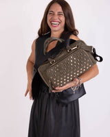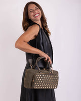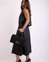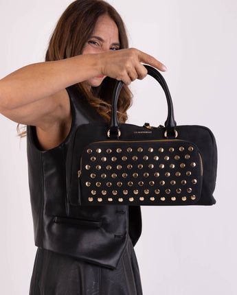 Patty è una borsa di edie dimensioni, molto capiente grazie ai suoi due comodi scomparti. Entrambi presentano la chiusura con cerniera. Il manico rigido, non removibile, garantisce portabilità a mano e a spalla, mentre la tracolla, removibile, in tessuto nero garantisce una vestibilità più comoda. Internamente si presenta foderata ed arricchita di taschini; esternamente, da un lato, presenta borchiette diffuse, dall'altro il claim "Santa pazienza" dona un tocco vivace al tuo outfit.