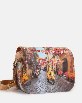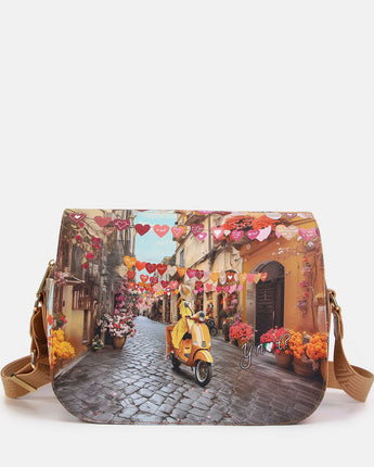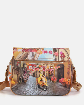 La borsa con patta di Ynot? è capiente ed organizzata. Presenta due scomparti con chiusura con zip, ognuno dotato di taschini interni. Presenta inoltre un taschino esterno con zip, per gli oggetti di primo utilizzo. La chiusura presenta patta e bottone metallico. La tracolla a nastro è larga, logata e regolabile per garantire una doppia vestibilità: a spalla e a tracolla.