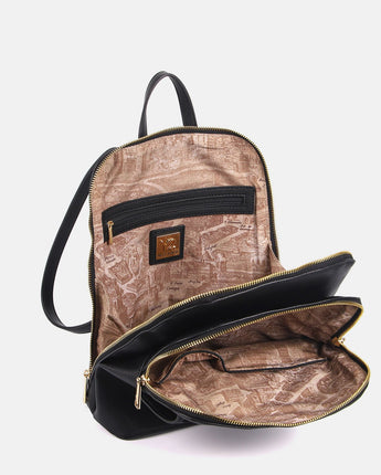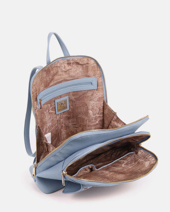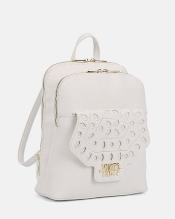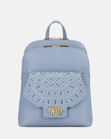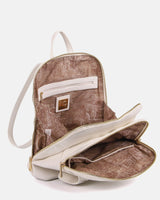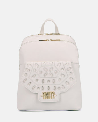 Lo zaino Martha è una chicca della nuova collezione Ynot. Capiente e super organizzato, grazie alla doppia tasca con chiusura con zip di cui è dotato, risulta delicato ed elegante. La tasca anteriore, infatti, presenta un motivo che richiama il pizzo san gallo che ricama la patta logata in color oro. Presenta un manico corto in tinta per portabilità a mano e spallacci regolabili.