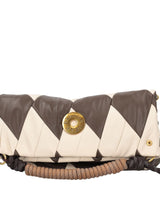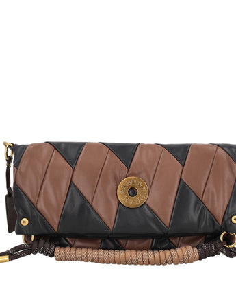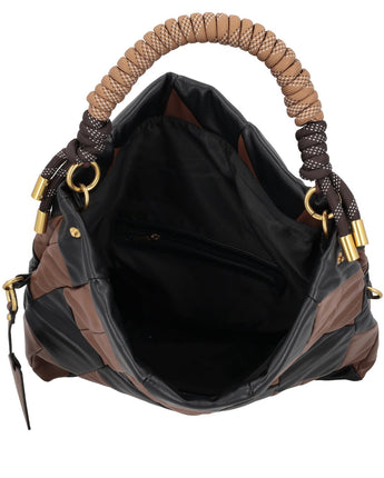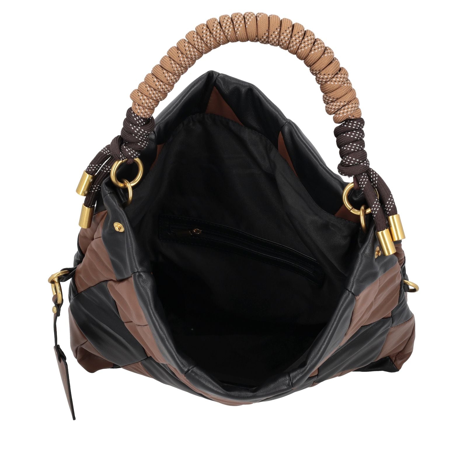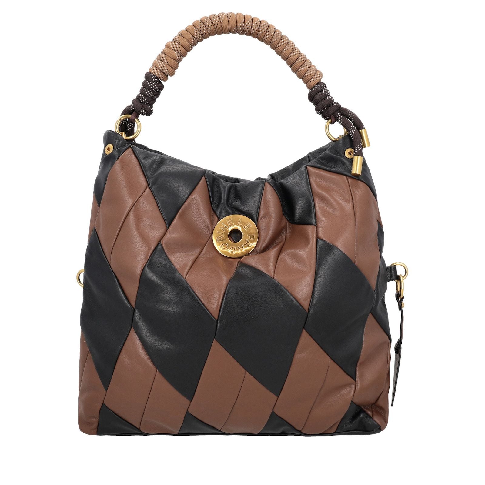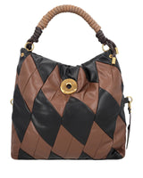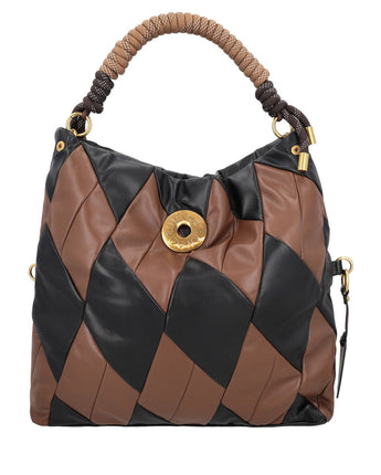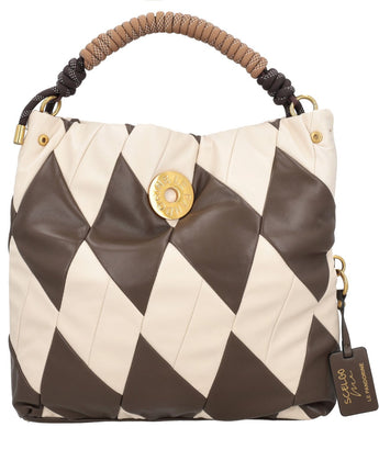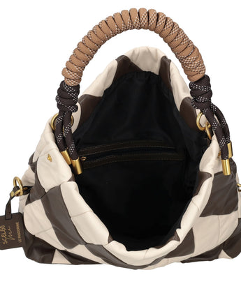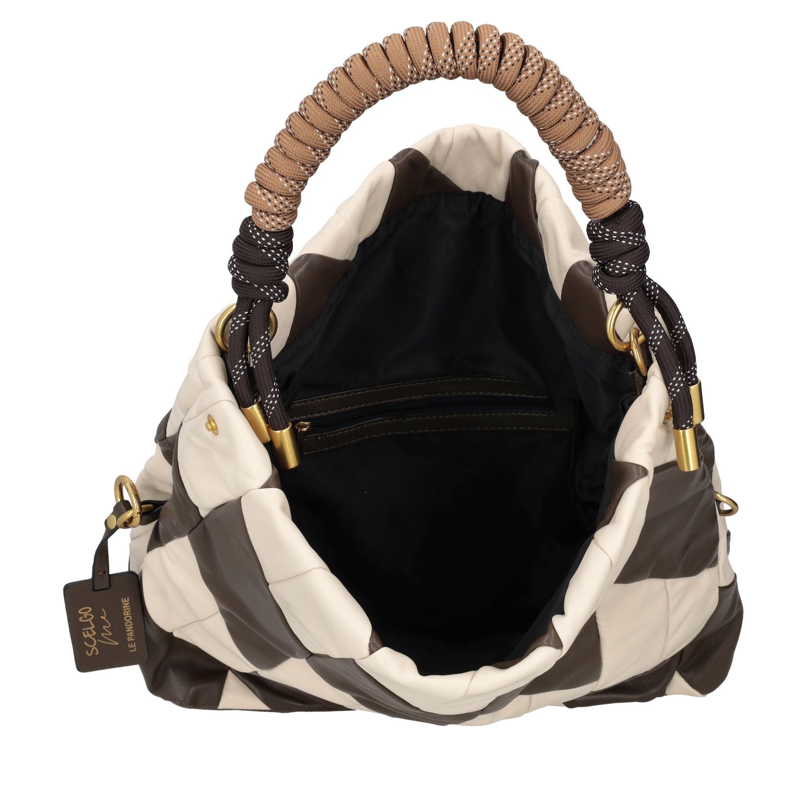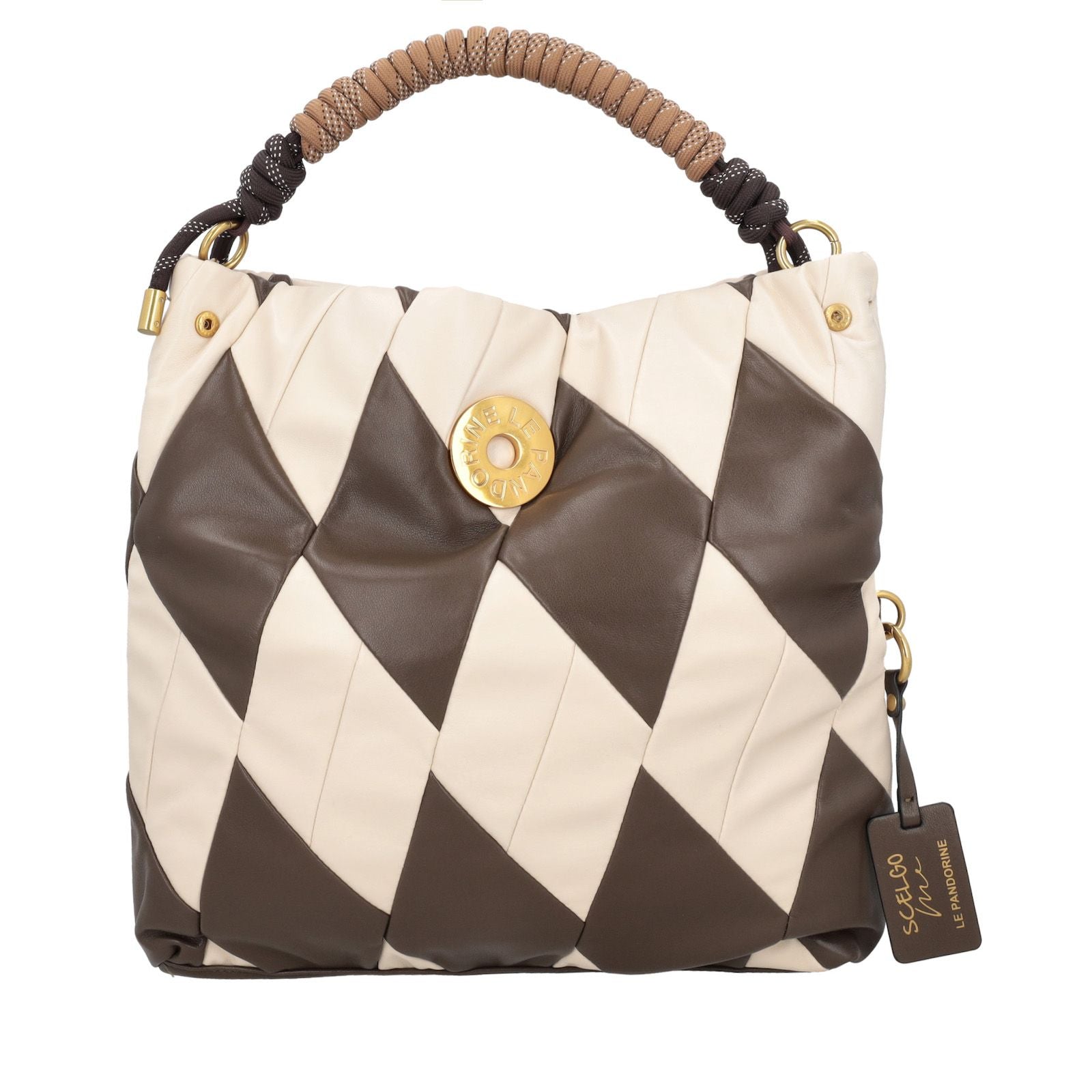 La borsa Le Pandorine Arlecchino unisce stile e funzionalità in un accessorio versatile. Morbida e capiente, si porta comodamente a spalla o a mano grazie al design pieghevole e alla tracolla staccabile e regolabile. Le forme intarsiate arricchiscono l’intera superficie, mentre il logo rotondo in metallo color oro anticato conferisce un tocco elegante. All’interno, la fodera con tasche, di cui una con zip, organizza al meglio i tuoi oggetti. Il manico intrecciato in scoobydoo e il ciondolo con claim "Scelgo me" completano questa borsa dallo charme unico.