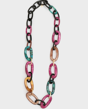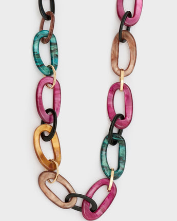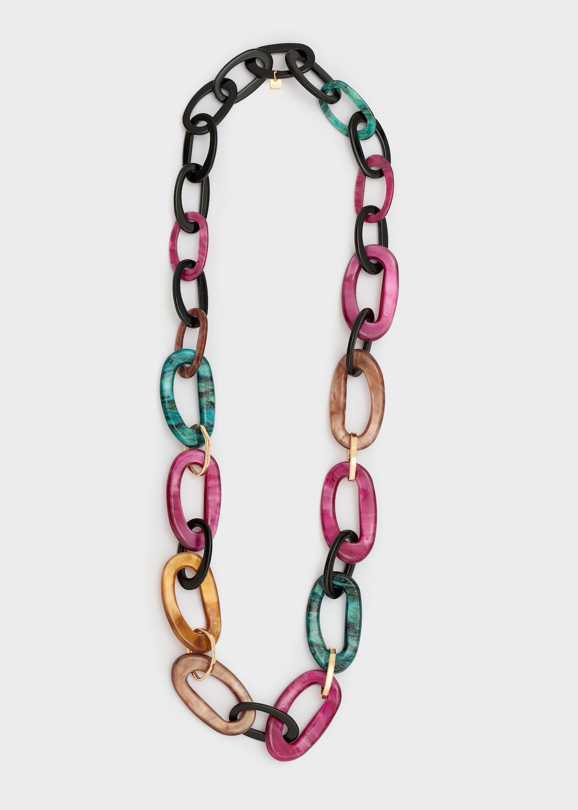 La collana lunga in resina di Nalì è un tripudio di luce e colore grazie alla sua catena multicolor! Perfetta per dare grinta al tuo outfit!